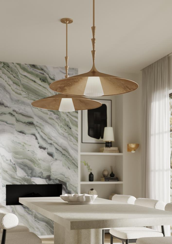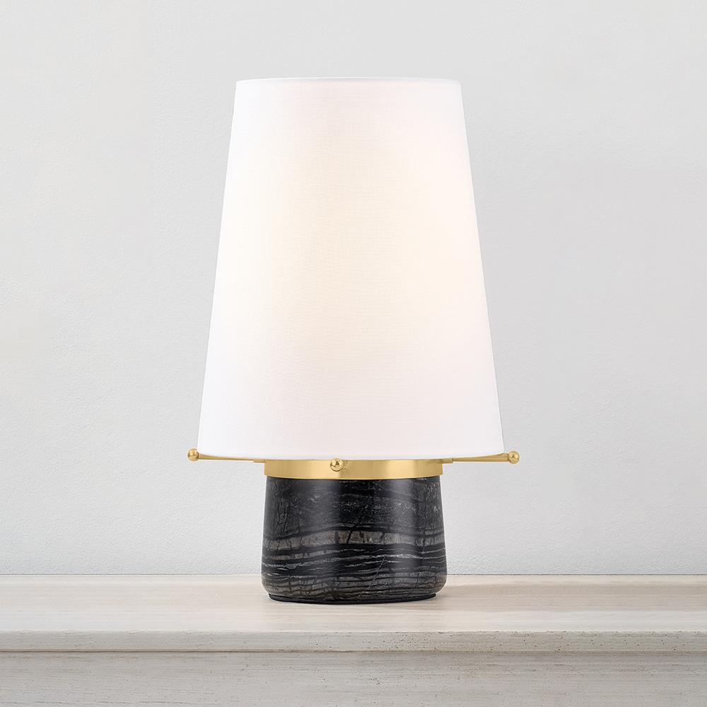 A clever play on proportions, shapes, and materiality, Central Valley is a petite table lamp with a big personality. A large white linen shade tops the weighty dark-honed Nero Madera marble base, with the shape of the shade following the exact angles of the stone. to bridge these two opposing forces, distinctive spokes extend from the base to secure the shade, adding a jewelry-like quality. The Aged Brass finish lends a stately sense of elegance. Due to the one-of-a-kind nature of the medium, exact colors and patterns may vary slightly from the image shown.