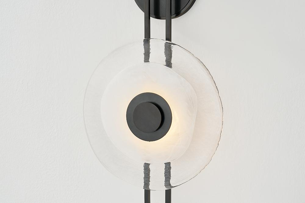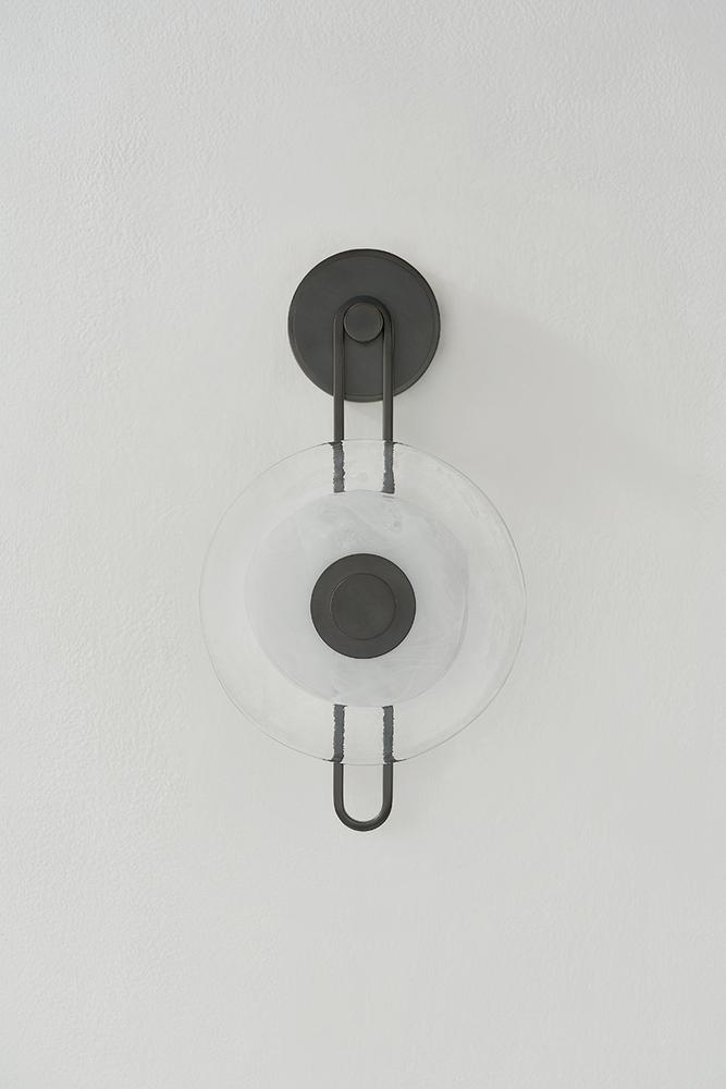 The earring-like design of Keuka Park exudes ornamental, graphic appeal. A thick disc of Blonchino Piastre glass is illuminated at the point where it attaches to the racetrack frame of this striking wall fixture. Whether finished in Aged Brass or Old Bronze, Keuka Park brings modernist artistry to any wall.