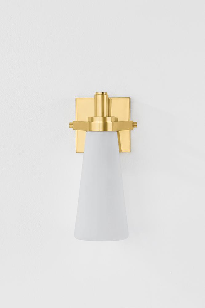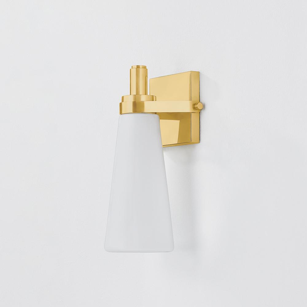 Form meets function in this simple yet refined sconce. The conical opal glossy glass shade of Trude tapers into a wider opening at the bottom, creating a powerful downlight. Rather than a traditional arm back, the upscale mechanical metalwork nods to mid-century modern design aesthetics. The frame is available in Aged Brass or Polished Nickel for a more classic or contemporary finish.