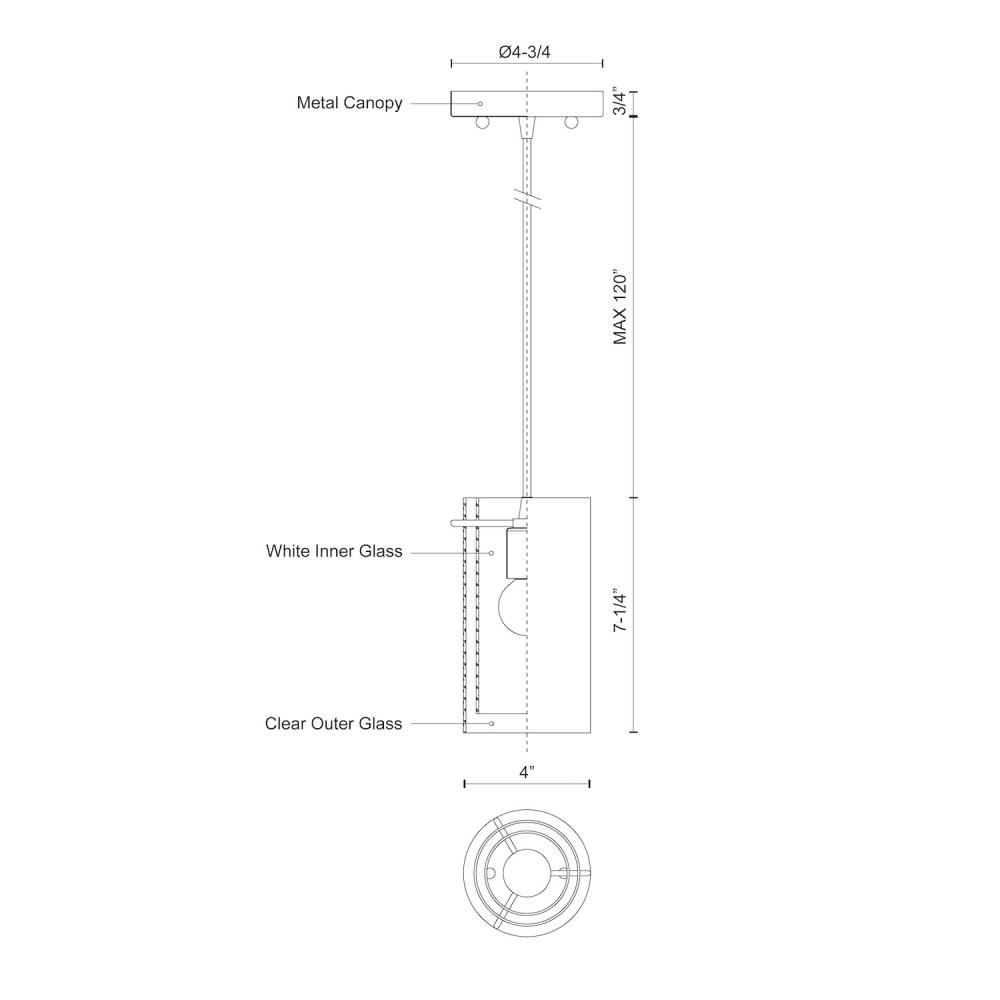 Single lamp pendant with white cylinder glass and opal inner cylinder glass with brushed nickel details.