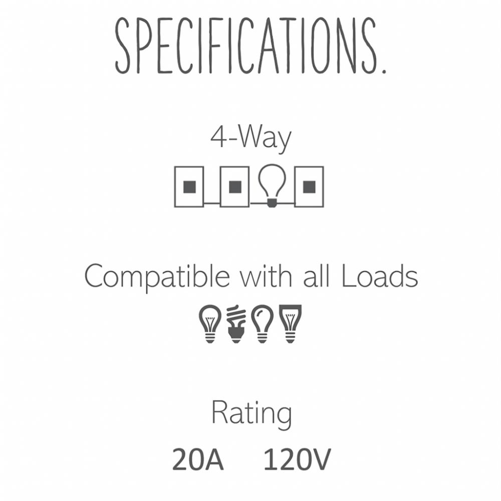 Gain control of a single light from even more locations with this 4-way 20A switch. Updating the classic up-and-down switch with sleek paddle control, this modern light switch lets you turn lights on and off with ease and style. Must be paired with additional switches to provide control from multiple locations.This switch* features enduring Microban? antimicrobial technology that works to reduce the growth of bacteria, around the clock, for the lifespan of the product.* Existing inventory of switches, dimmers and plastic wall plates from the adorne? Collection at some partner locations may not yet include Microban? protection. To confirm that a specific Legrand product is protected with Microban?, check that the exterior of the product packaging includes a green dot or a ""Protected with Microban"" label.Made exclusively for use with screwless Wall Plates from the adorne? Collection, sold separately.No antimicrobial efficacy claims are being made or are valid with respect to products sold in Canada.