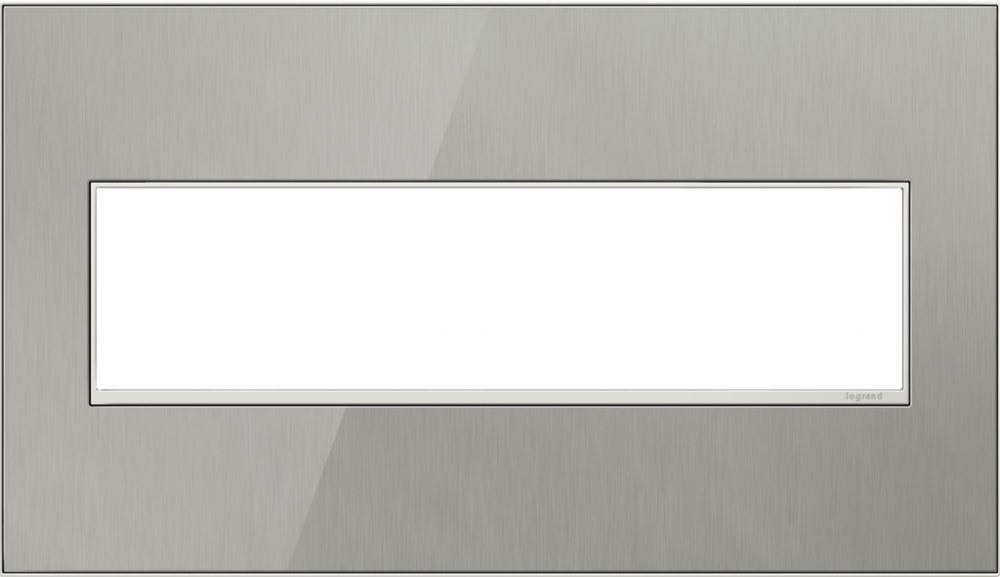 Stainless surface with satin nickel frame, for a trendy industrial touch that?s also sophisticated. A 1-Gang Wall Plate, it is perfectly sized to fit a standard-sized adorne device, or any combination of two half-sized adorne designer switches or outlets.