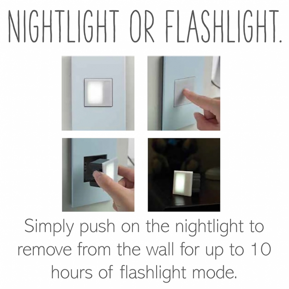 Perfect for when portable light is needed, whether it's during a power outage or simply while putting little ones to bed. As innovative as it is stylish, the device acts as a sleek in-wall nightlight until it?s popped out to travel as a mobile light source. Simply press and release the nightlight to take it with you on the go, for up to eight hours of battery-operated light. Batteries come installed and recharge while in the wall caddy.
