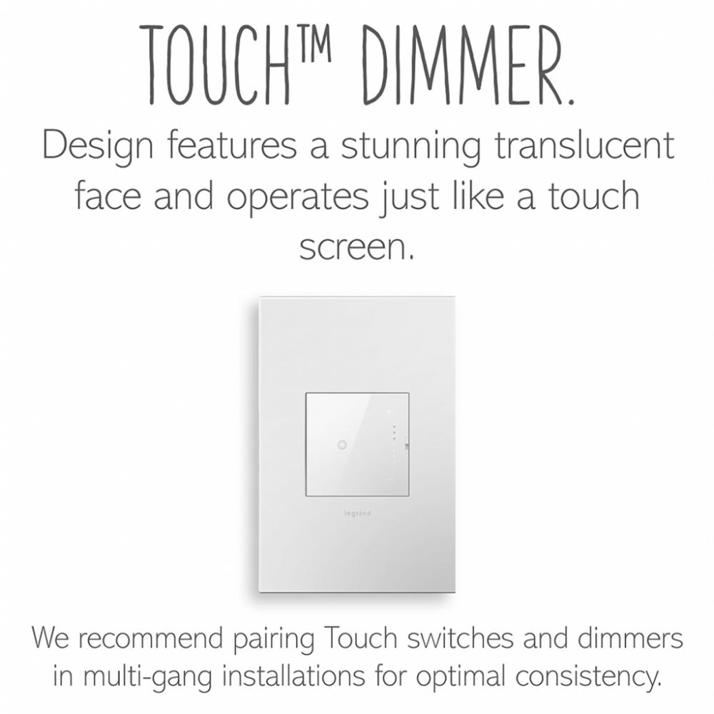 This dimmer switch from the adorne Collection features a translucent, glass-like face and operates with the simple touch of a finger on the center circle to turn lights on/off, or by using the + or - on the side to dim. In multi-gang installations, we recommend using the Touch-control modern light switches and dimmers together for consistency of control and aesthetic. A Tru-Universal Dimmer, this device self-calibrates to work with virtually any 120V dimmable bulb or fixture (excludes 0-10V).This dimmer* features enduring Microban? antimicrobial technology that works to reduce the growth of bacteria, around the clock, for the lifespan of the product.* Existing inventory of switches, dimmers and plastic wall plates from the adorne? Collection at some partner locations may not yet include Microban? protection. To confirm that a specific Legrand product is protected with Microban?, check that the exterior of the product packaging includes a green dot or a ""Protected with Microban"" label.Made exclusively for use with screwless Wall Plates from the adorne? Collection, sold separately.No antimicrobial efficacy claims are being made or are valid with respect to products sold in Canada.