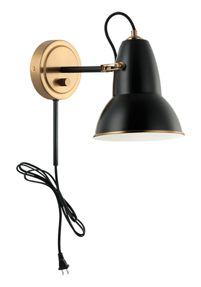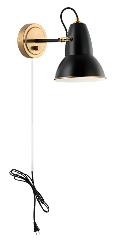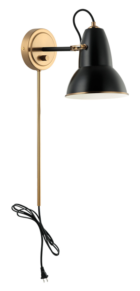 A playful yet sophisticated wall sconce collection. Designed with a dome shaped adjustable shade with Aged Gold Brass trim. This is extended with an adjustable arm. Features a built in dimmer, and available in 2 finish combinations and 2 sizes.