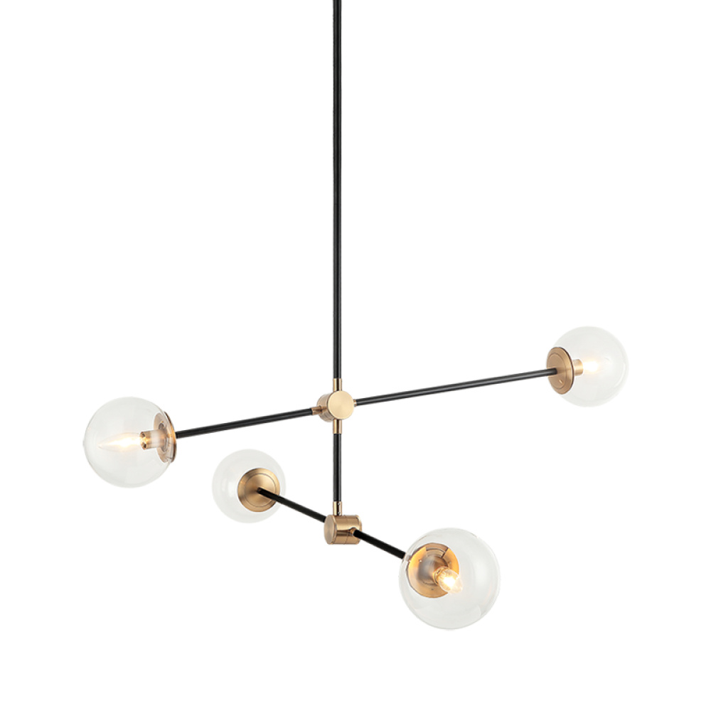 Cosmic is arranged with long, sleek, black rotatable rods, paired with Aged Gold Brass finish details. This collection is available in 3 sizes in either Clear or Opal glass to provide a stunning yet minimalistic look. The creativity of this series adds a unique detail to any space.
