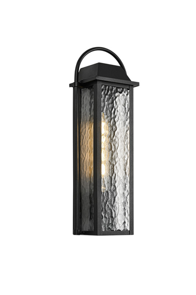 Dew Classic charm meets modern durability. This outdoor wall lantern features a Matte Black iron frame paired with textured water glass, casting a warm, inviting glow that adds depth and character to entryways, patios, and porches. Its lantern-inspired silhouette and graceful top arch provide a refined, architectural presence. LIGHTBULBS NOT INCLUDED