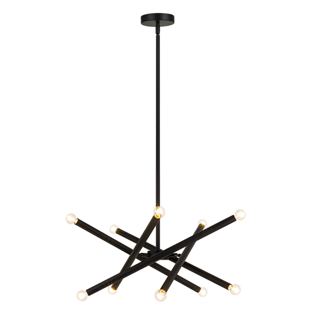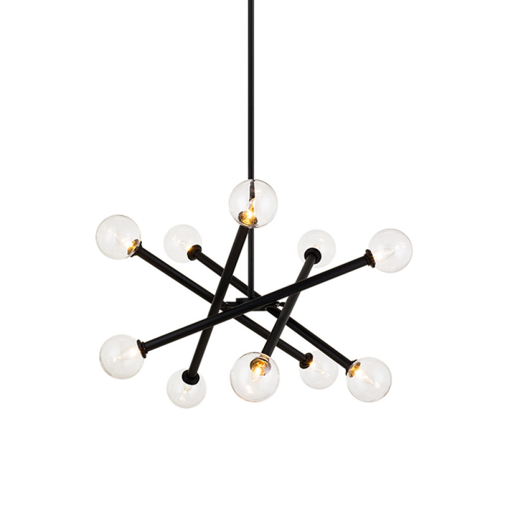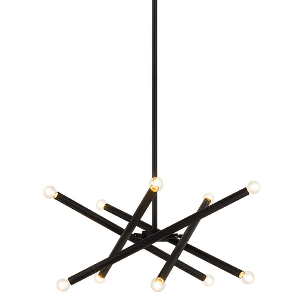 Matchstix chandelier will be a dramatic addition to any room. Modern movement in the crossing bar design will be a signature piece. Available in Aged Gold Brass or Black with either Clear or Opal glass.