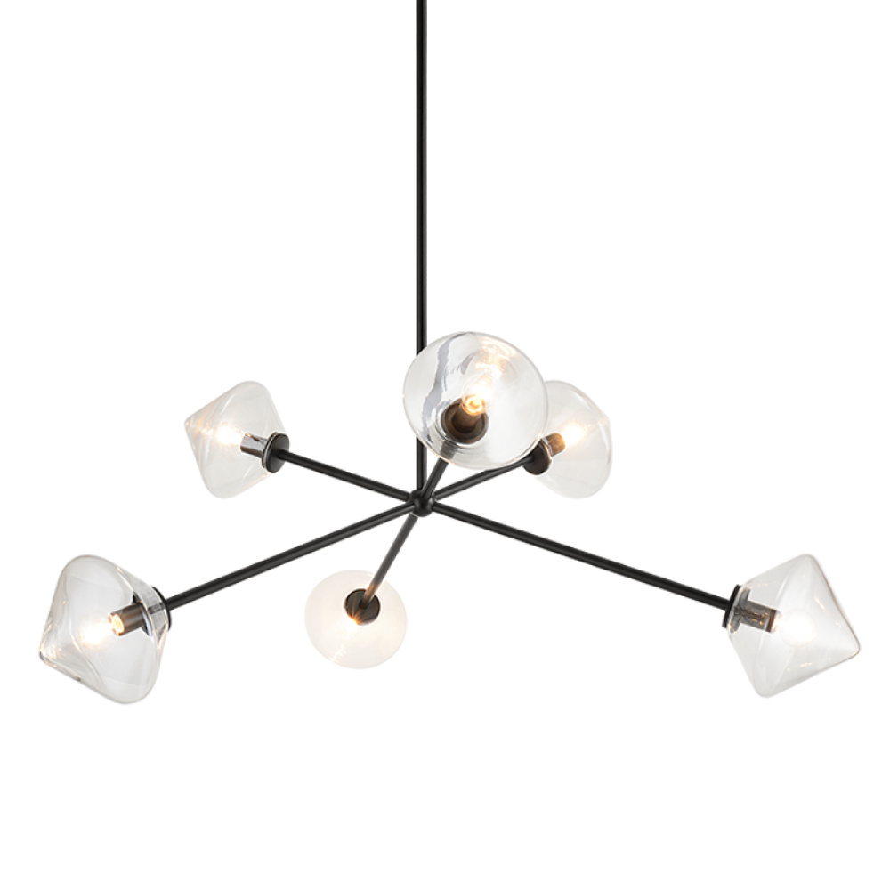 Novo is modern yet classic – available in the form of chandelier, wall sconce, and flush mount. The rods and base are either Aged Gold Brass or Black finish paired with a contrasting Opal or Clear round glass and diamond shaped glass. The style is very versatile and will add beauty to multiple rooms.