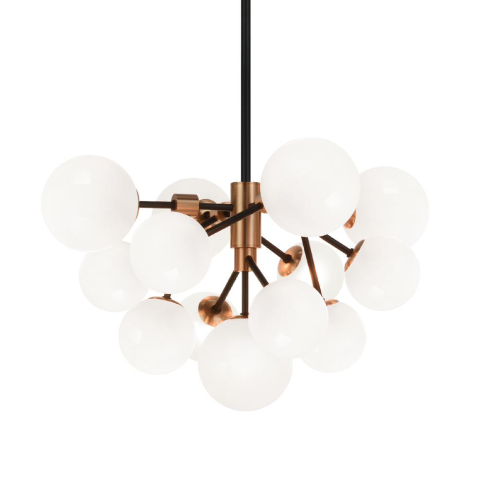 A retro inspired collection that will integrate seamlessly with many decors. Novu comes in Opal glass on sleek black rods offset with Aged Gold Brass accents. Available in a complete family including various sized ceiling fixtures, a wall sconce and a flush mount.