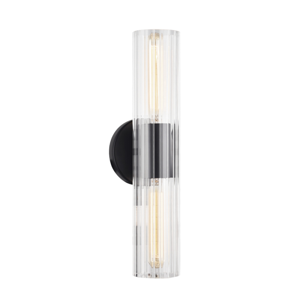 An elegant collection that features intricate detailing of clear ribbed glass. The versatility of this collection allows the fixtures to be mounted vertically and horizontally. Odette is available in 3 finishes: Aged Gold Brass, Black and Chrome as well as 2 sizes; a perfect touch to illuminate any space.
