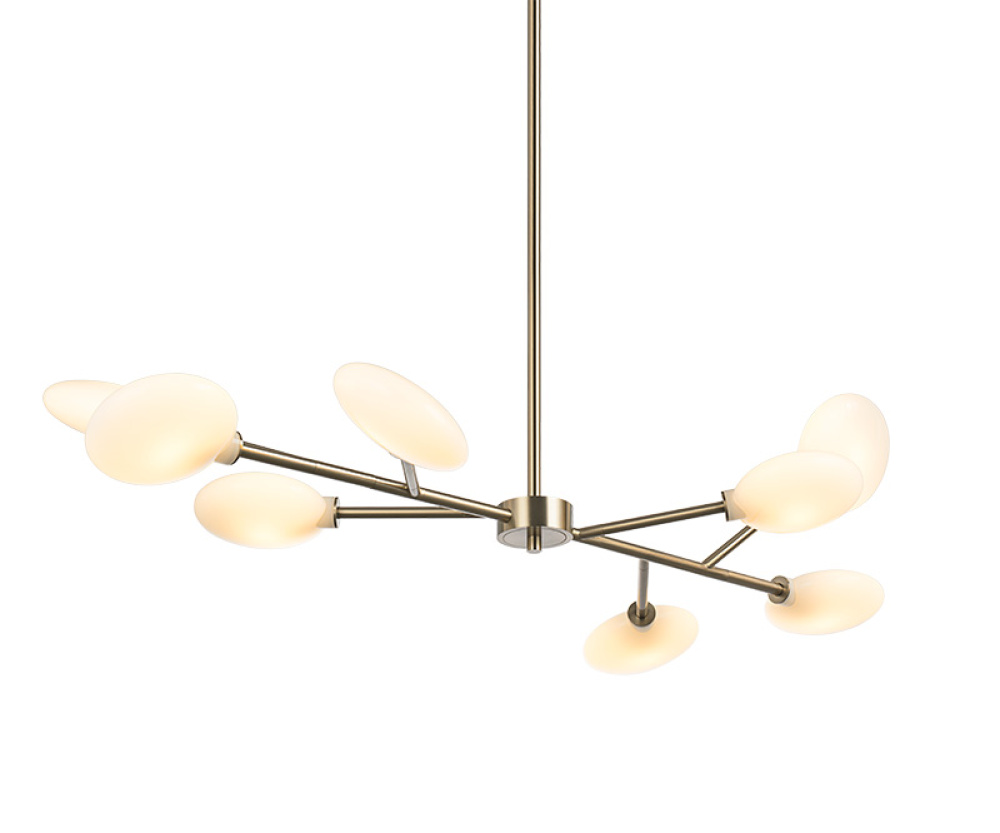 Peon A modern masterpiece with timeless warmth, this chandelier introduces contemporary sophistication through its radiant, pebble-shaped opal glass shades arranged in a striking starburst formation. The larger glass elements echo the sculptural beauty of our Hydrangea series. Each opal diffuser casts a soft, inviting glow, balancing ambience with artistic presence. Available in Champagne Gold or Matte Black finishes. LIGHTBULBS NOT INCLUDED