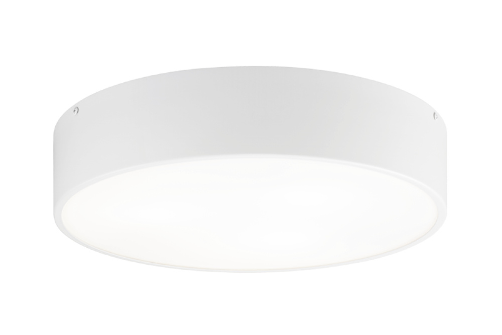 A classic round flush mount offered in two sizes and four finishes. Straight sided round metal bands finished in Aged Gold Brass, Bronze, Chrome or White completed with a frosted glass lens.