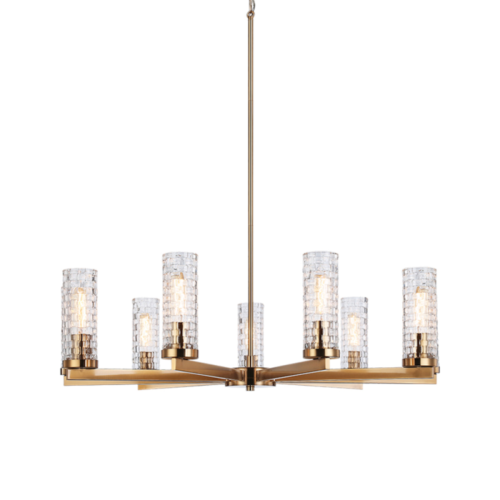 Weaver The distinctive woven patterned glass will undoubtable set a room apart. The Weaver collection is truly a conversation piece.With the unusual glass, the single light pendant and the stunning 6 or 9 light chandeliers will be a stand out feature.The wall mounts come in 2 styles in a single and two light option. Available in Aged Gold Brass and Black finish. LIGHTBULBS NOT INCLUDED