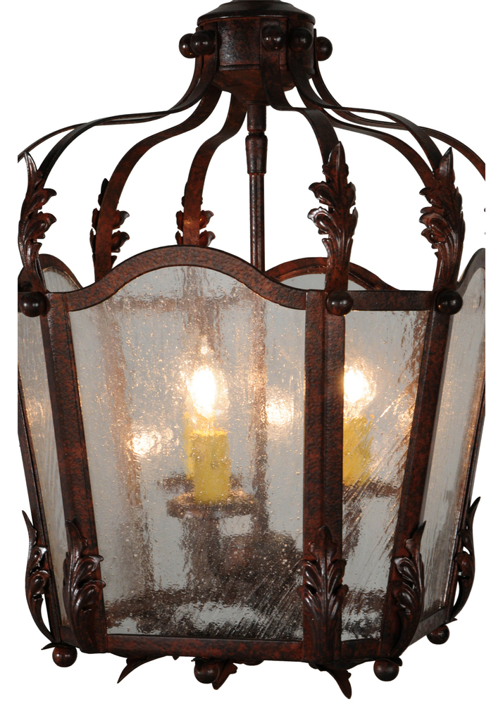 Utilizing a blend of timeless craftsmanship and classic design; the ever-popular Citadel brings home unsurpassed quality and shapely appeal. Evoking a dramatic effect; beautiful ambient light is evoked through Clear Seeded Glass which reveals a 3-light faux candelabra within this pendant. Citadel is enhanced with a dramatic design; stunning Acanthus leaf accents and frame featured in a Rusty Nail finish. The fixture is handcrafted by skilled artisans in our American factory in Upstate New York. Custom options include various sizes; colors; designs and dimmable energy efficient lamping. UL and cUL listed.