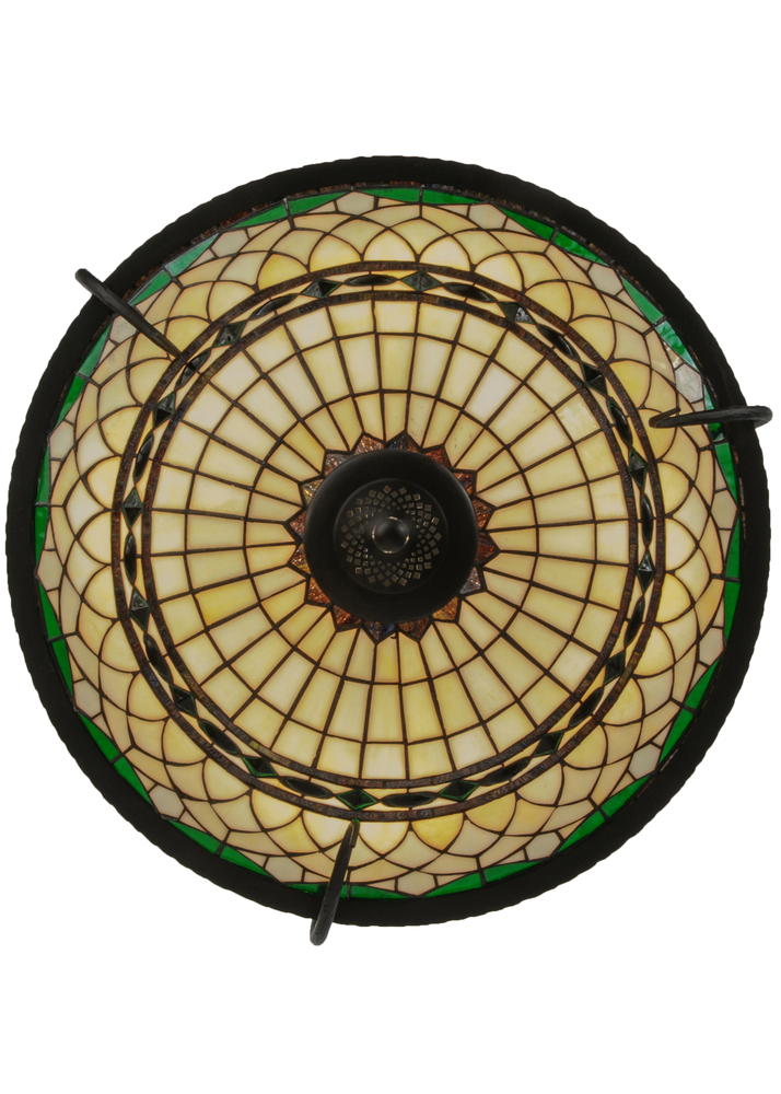 Emerald jewels and Multi Colored granite glass accent Snow White stained art glass in this large Tiffany Reproduction Roman ceiling pendant. Inspired by Italian art and architecture; this pendant is handcrafted of authentic stained art glass by skilled artisans using the famous Meyda copperfoil construction method. The stunning; elaborate hardware is custom hand-forged to the exact specifications and finish of the customer. Custom colors and dimmable lamping options are also available. UL and cUL listed for damp and dry locations.