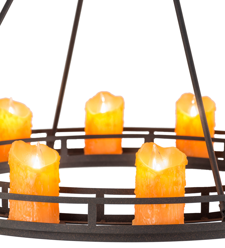 Gothic beauty meet rustic charm with this chandelier; which was designed with a steel ring featured in a warm Dark Roast finish.12 Amber Resin faux candlelights adorn this fixture; which is custom crafted by the skillful hands of Meyda artisans in Upstate New York in the USA. Energy efficient lamping options are available; as well as custom sizes; styles and colors.