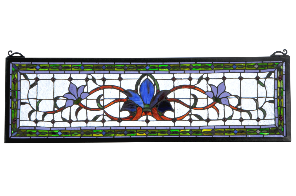 Herald in a touch of class to your home with this stylized floral stained glass window that features beautiful vivid colors in a simplistic design. At the focal point of this window is a cobalt flower flanked by violet flowers on each side. mahogany stems and green leaves wed the floral design on a clear back ground accented with plum jewels. A green chain link design accented with blue diamonds and plum jewels is surrounded by violet to complete the design. This stunning window is created using Meyda Tiffany?s famous copper foil construction process and attached to a Black frame. This transom window can be used above a door or placed as a pair on both sides of a door; especially in entryways. Brackets and hanging chains are included.