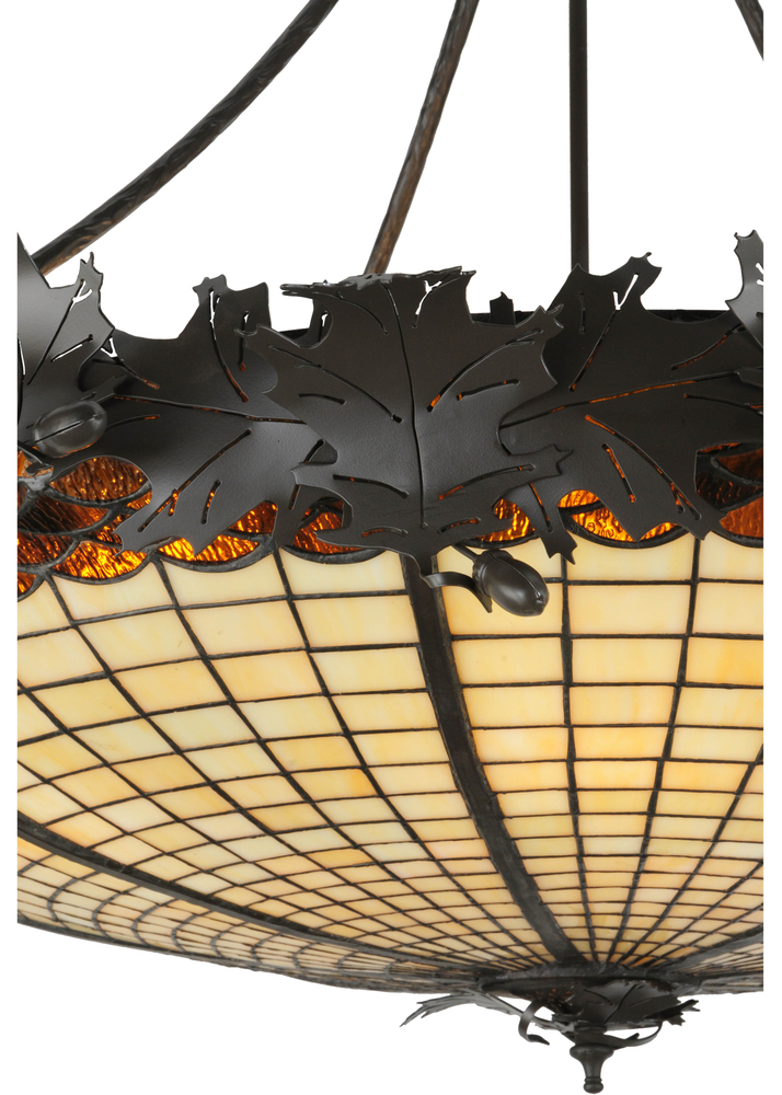 This eye-catching chandelier in a Timeless Bronze finish is as majestic as the mighty oak. The stained glass shade delights with Autumnal Beige Art glass with a Bark Brown and Blue and Purple Granite Textured Glass crown that sprouts oak leaf-covered hardware that is handmade by Meyda artisans. The pendant shade is created using the famous Meyda Tiffany copperfoil construction process. The overall height ranges from 43 to 72 inches; as the chain can be easily adjusted in the field. The Greenbriar Oak Pendant is included in our American-made; American-designed; handcrafted Greenbriar Collection. Manufactured in Yorkville; New York. UL and cUL listed for dry and damp locations. No two art glass shades will be the same; their individuality can be as remarkably unique as their personality.