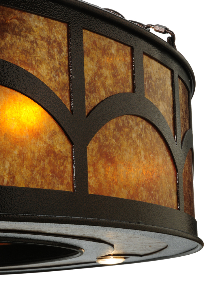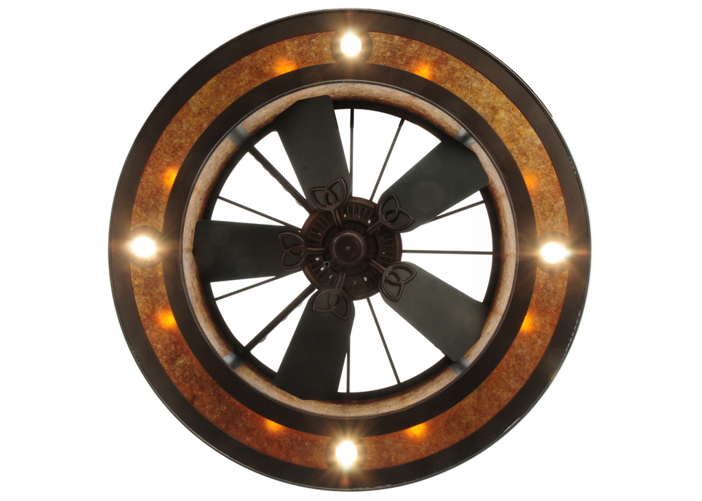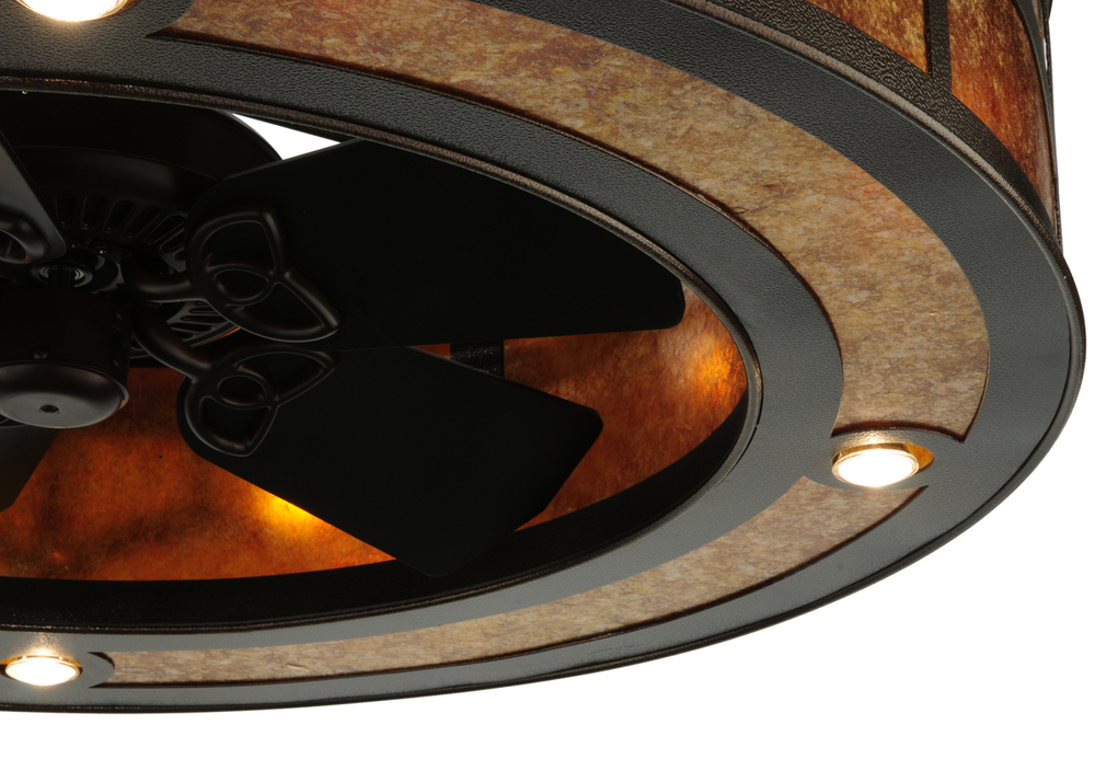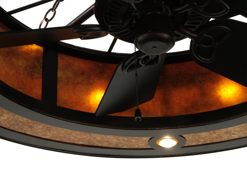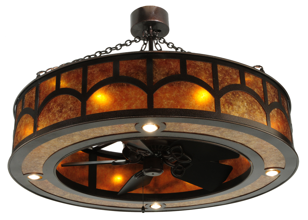 A fan-tastic; energy efficient decorating idea for a home; retail or hospitality location; this unique custom crafted Chandel-Air is accentuated with an abstract hilltop design on stunning Amber Mica. The diffuser is complemented with hardware and accents featured in a Copper Vein finish. This modern marvel includes eight inner lights for decorative illumination; four uplights that provide ambience; and four downlights for task lighting. This fixture is handcrafted by Meyda artisans at the foothills of the Adirondack Mountains. In summer; the fan pushes down a windchill that circulates to keep the space cool and comfortable. In winter; the fan is reversed to pull the room air up towards the ceiling and force the warm air back down and circulate to create warmth. Custom sizes; styles and colors; as well as dimmable energy efficient lamping options; are offered.