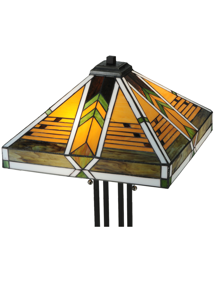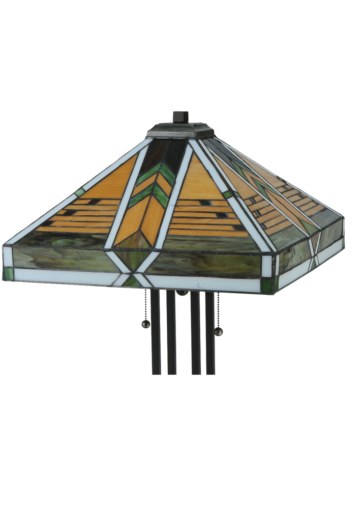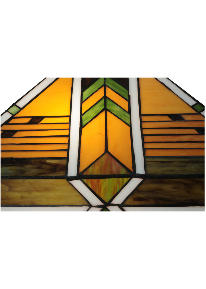 Offering a unique and handsome Mission design; Abilene uses colorful arrowheads of Honey; Woodsy Green and Bark Brown on a multi-designed motif of linear locks of Green; Bark Brown and Amber. The handcrafted stained glass shades; which feature a Mission design that interprets organic objects into geometric forms; are framed in White with Woodsy Green glass and was created using Meyda Tiffany's famous copperfoil construction process. The shade is complemented with Mahogany Bronze finished four-column base.