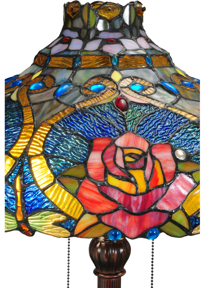 The Dragonfly re-creates Tiffany Studio's most beloved designs in all of its splendor. A Dragonfly flies and dives downward with glowing Golden jeweled eyes and delicate Yellow and Green glass wings that circle over hand-cut and copperfoiled pieces of Golden scrolls with Sky Blue; Clear and Red jeweled dew drops. Red Cabbage Roses are featured on a Blue and Green background which is topped with a crown of Lavender flowers.The art glass shade is created with Meyda Tiffany?s famous copperfoil construction process and complemented with a Mahogany Bronze finished base.