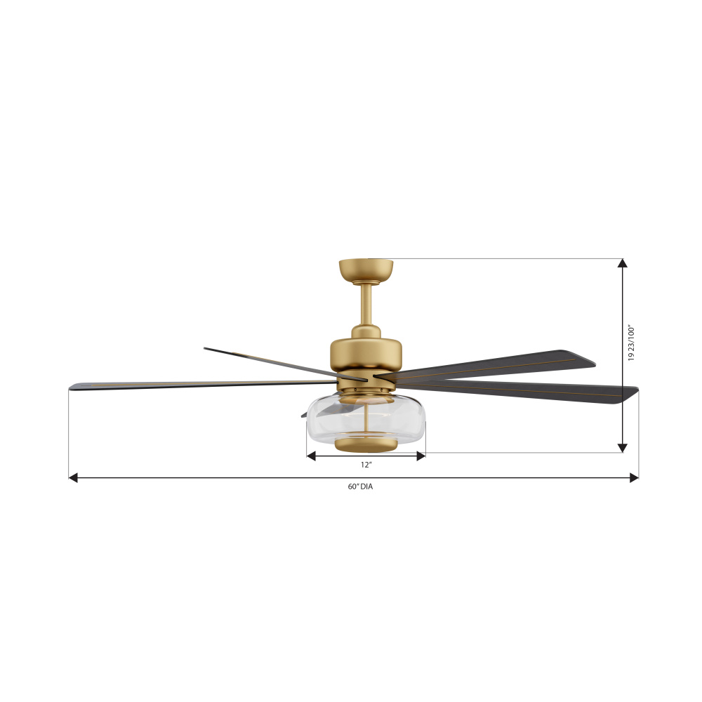 Featuring a Heritage Brass finish with Coal blades and Clear shade.