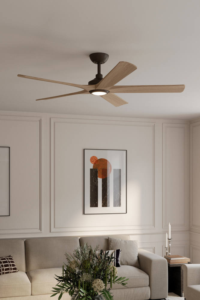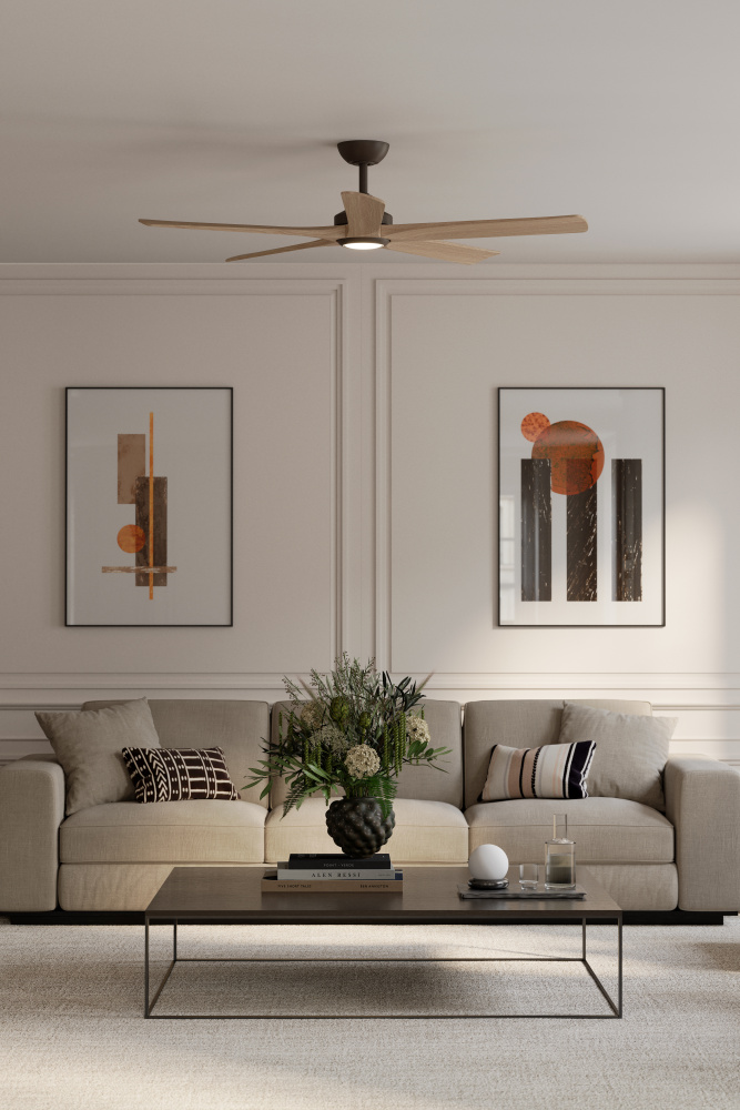 Featuring a Dark Bronze finish with Ashwood blades and White shade.