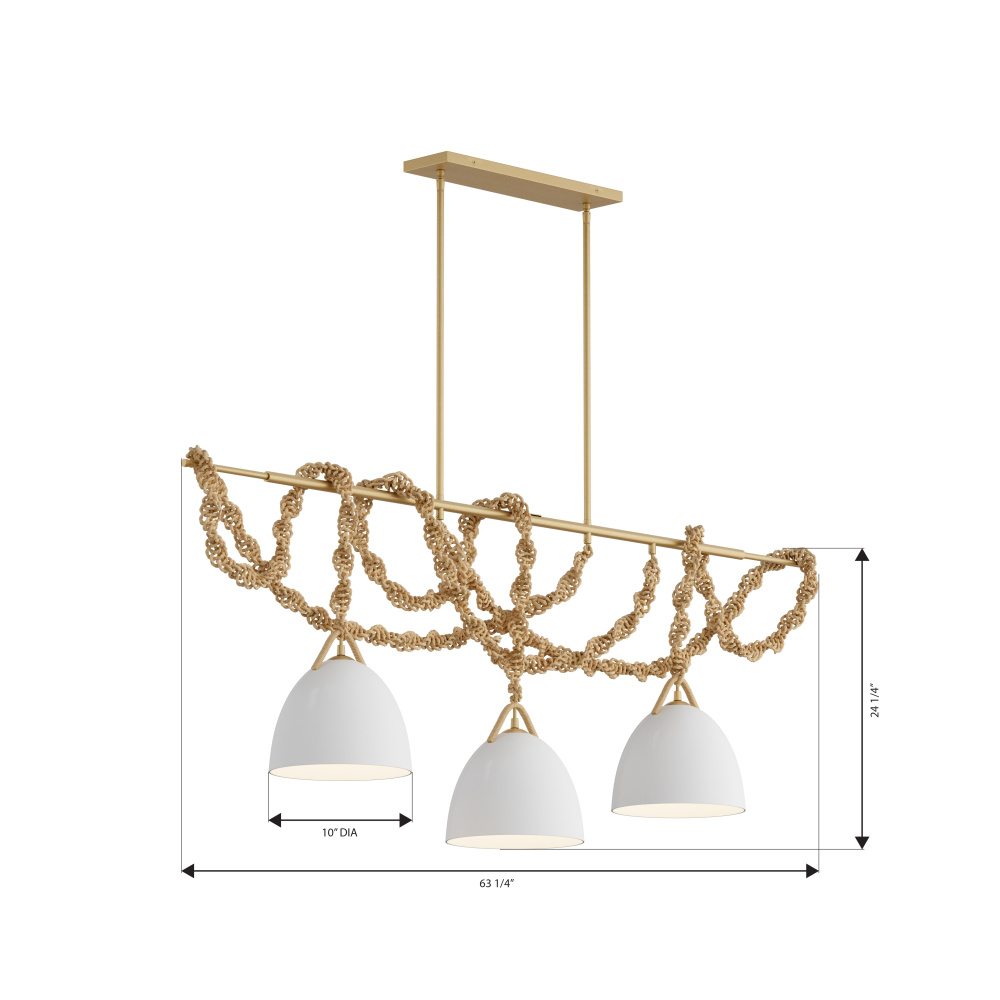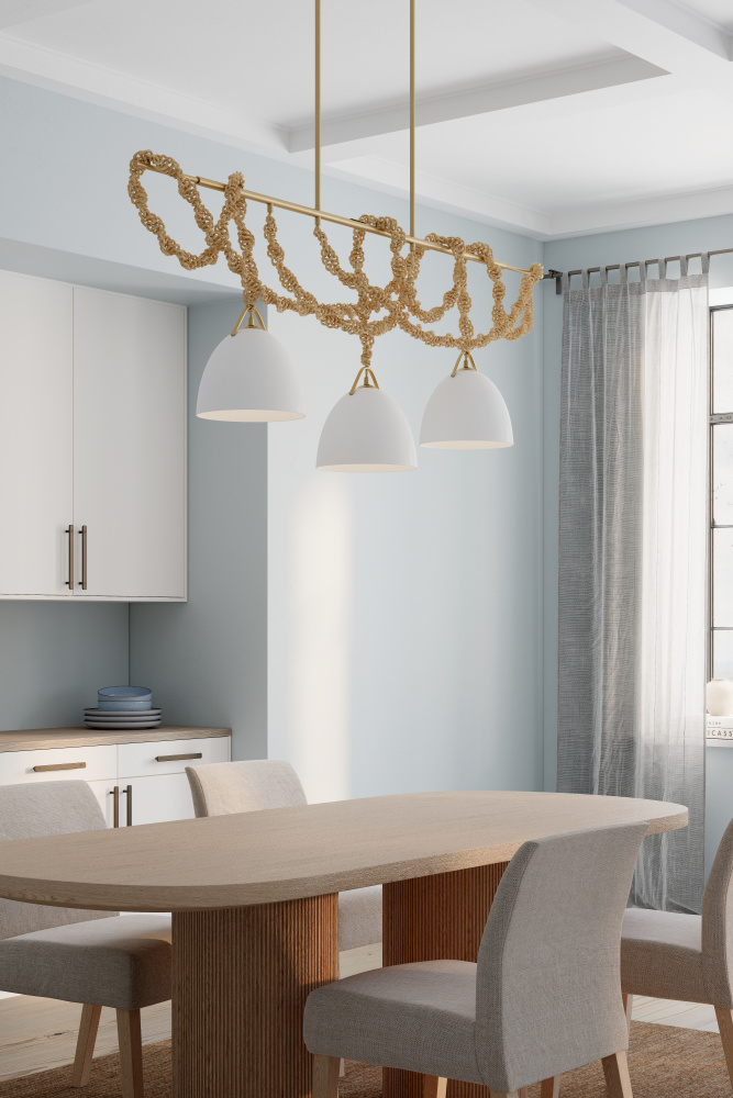 3-Light Linear Chandelier - Legacy Brass with White Ceramic and Paper Rope
