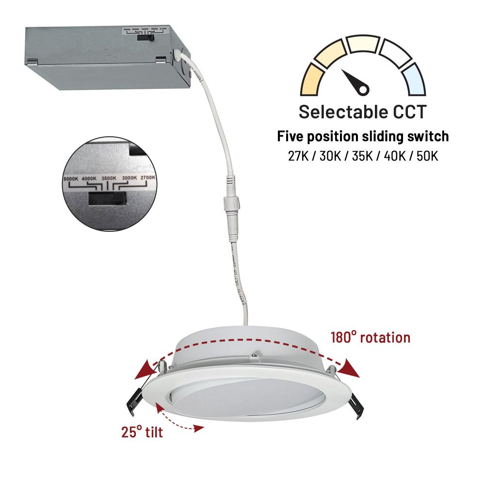 6" FLIN adjustable can-less LED downlights feature two-axis rotation with 25? tilt and 180? rotation. Can-less downlights are easy to install in new construction or remodel applications. Luminaires include a selectable color temperature switch located on the junction box of each luminaire with a quick connect that allows for easy disconnect and mounting in the ceiling.
