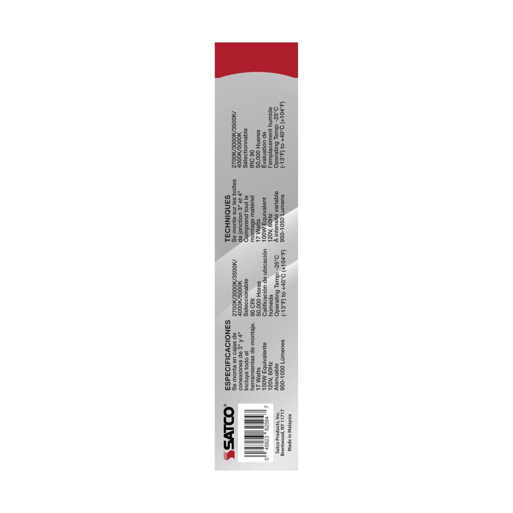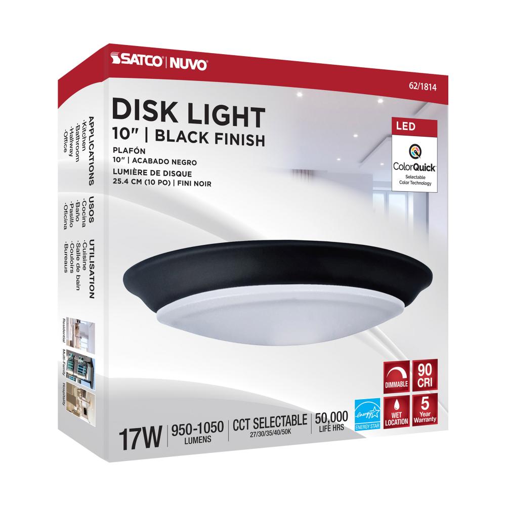 Introducing SATCO NUVO's 62-1814 LED CCT Selectable Disk Light with ColorQuick technology! This 10-inch, 17-watt disk light in black features a high CRI of 93, 2.5kV surge protection, and wet location rating. This CCT Selectable Disk Light is rated for