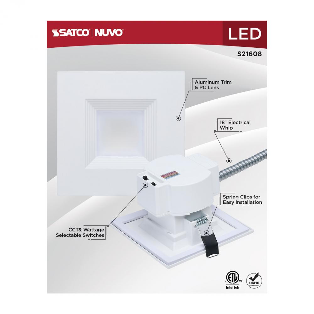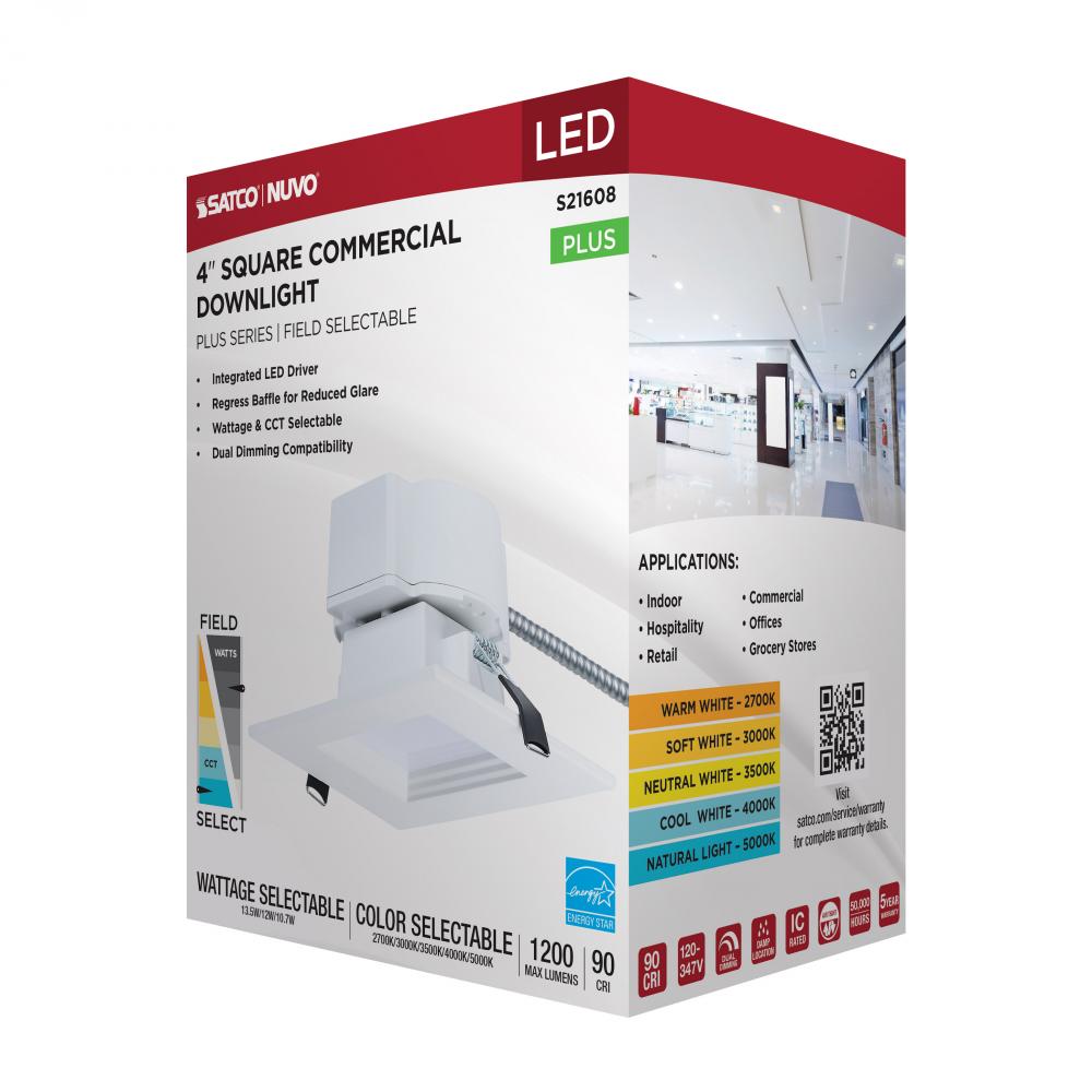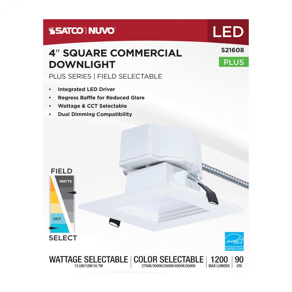 SATCO NUVO's Plus Series LED Commercial Downlight, S21608, delivers exceptional performance and versatility for today's remodel or new construction commercial environments. This 4-inch square fixture features field-selectable wattage and CCT settin