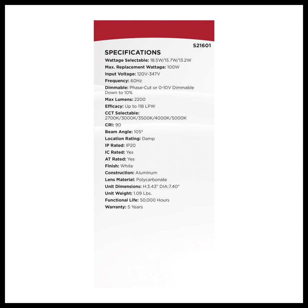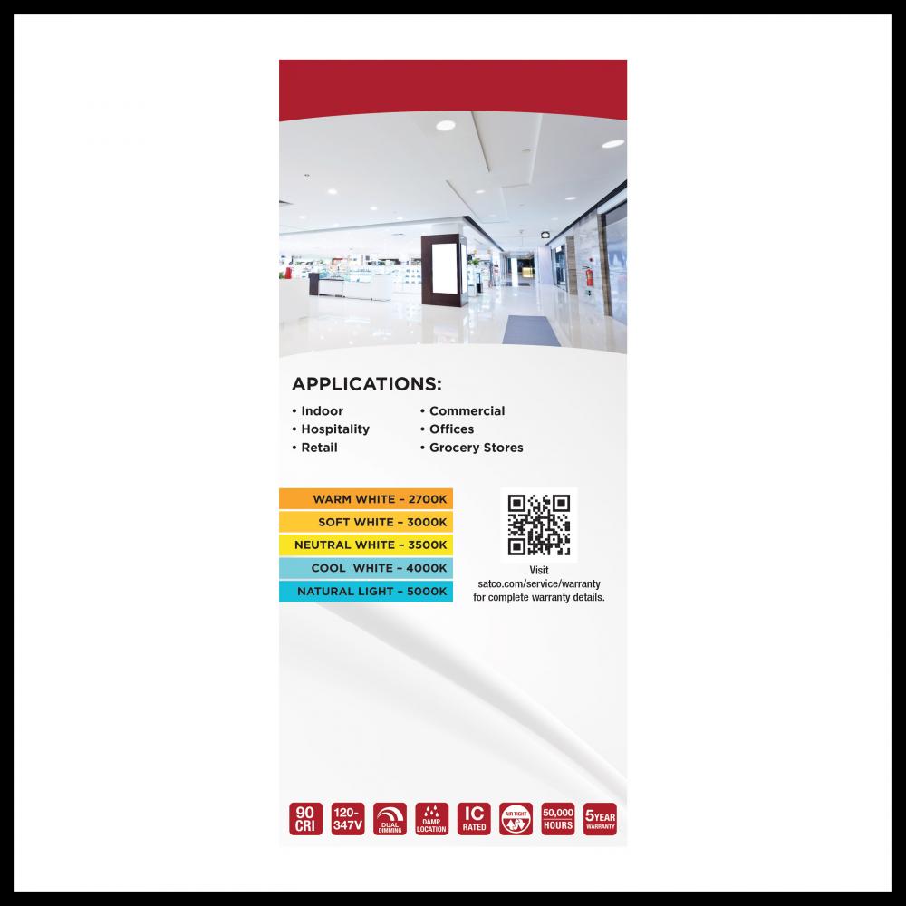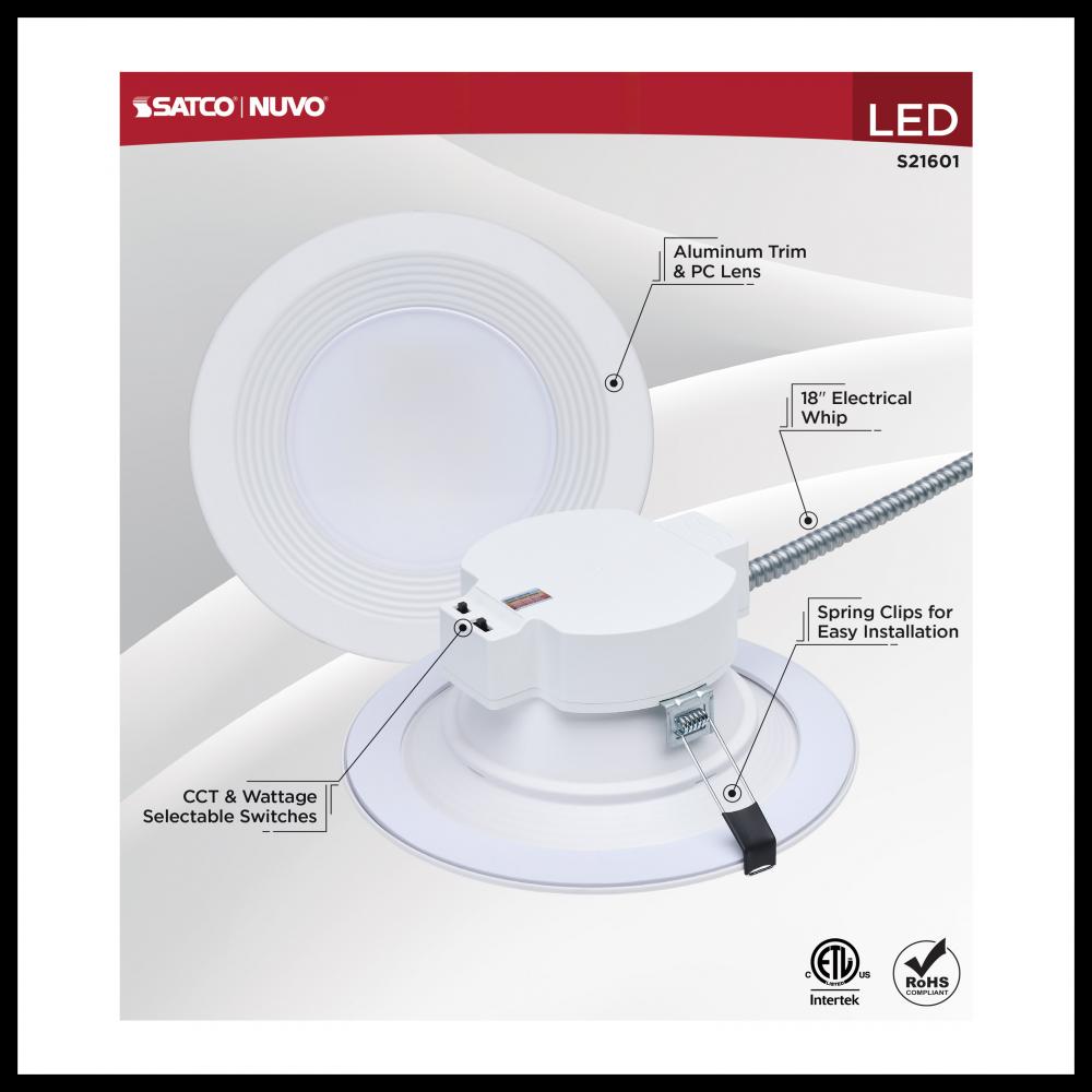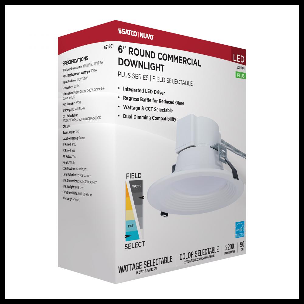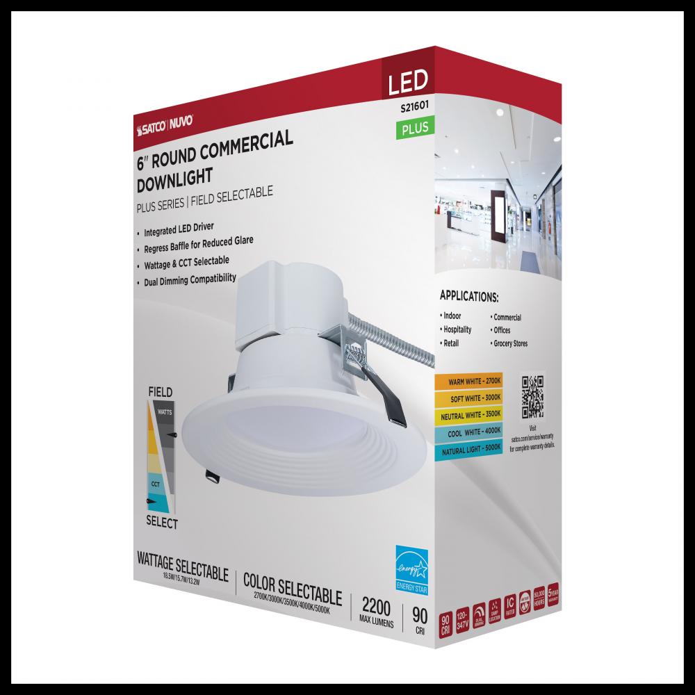 SATCO NUVO's Plus Series LED Commercial Downlight, S21601, delivers exceptional performance and versatility for today's remodel or new construction commercial environments. This 6-inch round fixture features field-selectable wattage and CCT setting