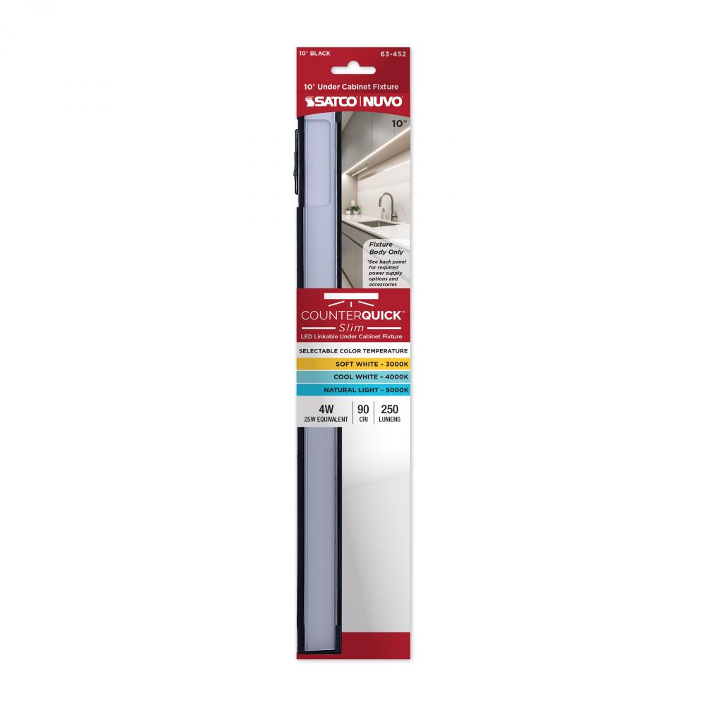 Bring stylish simplicity to your undercabinet lighting with SATCO NUVO's 63-452 CounterQuick Slim 10-inch fixture in black. At 4 watts, this sleek and energy-efficient fixture offers selectable color temperatures (3000K/4000K/5000K) and a low-profile d