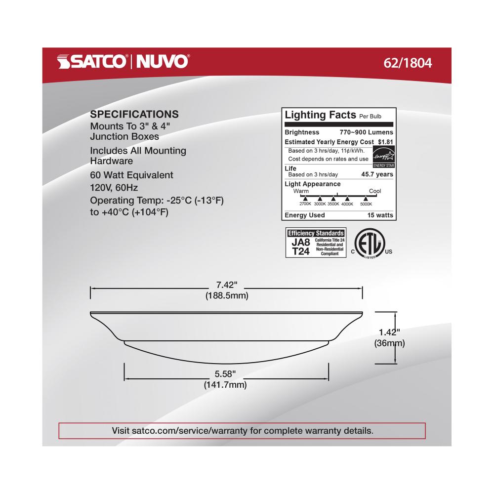 Introducing SATCO NUVO's 62-1804 LED CCT Selectable Disk Light with ColorQuick technology! This 7-inch, 15-watt disk light in black features a high CRI of 93, 2.5kV surge protection, and wet location rating. This CCT Selectable Disk Light is rated for