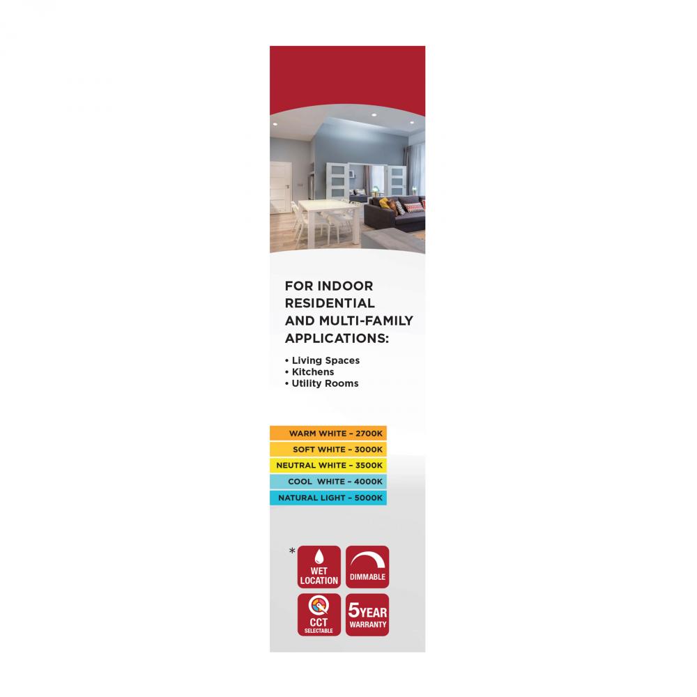 Integrated LED featuring 8 watts, 5-CCT selectable from warm white to natural light, 90 CRI