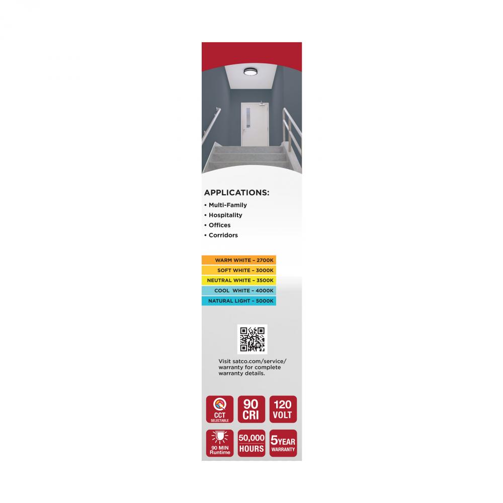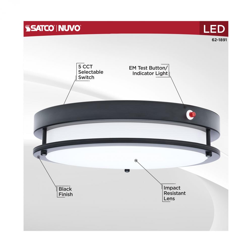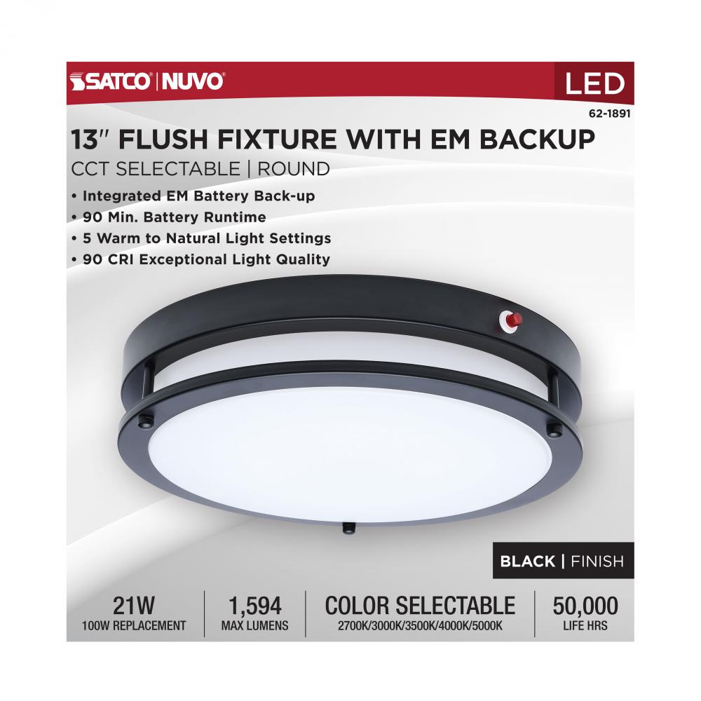 The SATCO NUVO 62-1891 13-Inch Glamour LED flush mount fixture in matte black features a built-in emergency battery backup that provides up to 90 minutes of illumination during power outages-offering critical reliability with an elegant design. An integrat