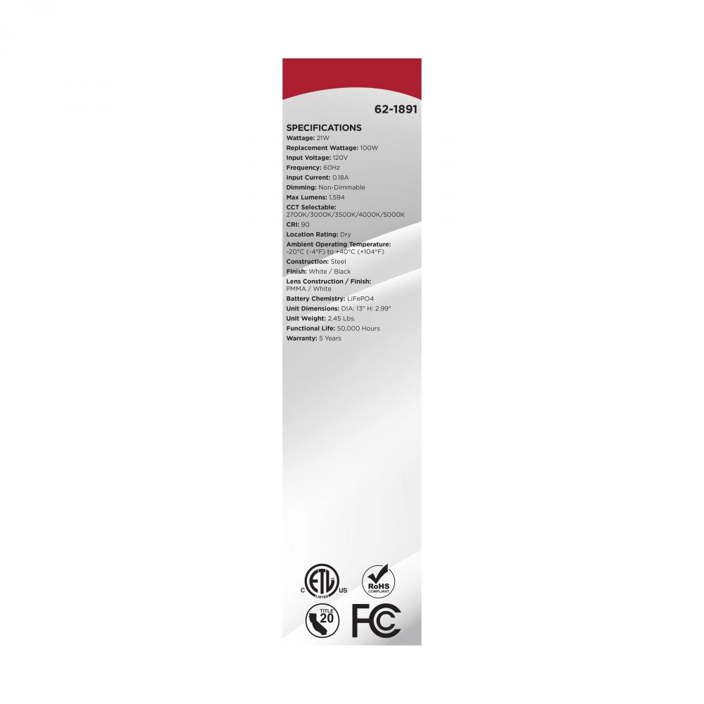 The SATCO NUVO 13-Inch Glamour LED flush mount fixture features a built-in emergency battery backup that provides up to 90 minutes of illumination during power outages-offering critical reliability with an elegant design. An integrated emergency test butto