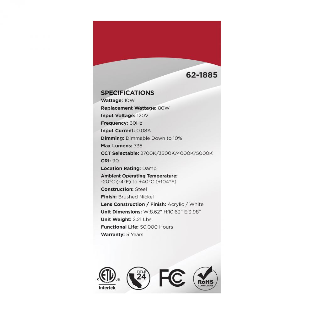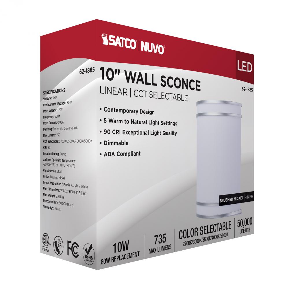 The SATCO NUVO 62-1885 Glamour Wall Sconce in Brushed Nickel delivers sleek, modern lighting with 5 CCT selectable technology (2700K–5000K) and 90 CRI illumination for vibrant color rendering. This 10-watt fixture replaces 80W incandescent lighting, prov
