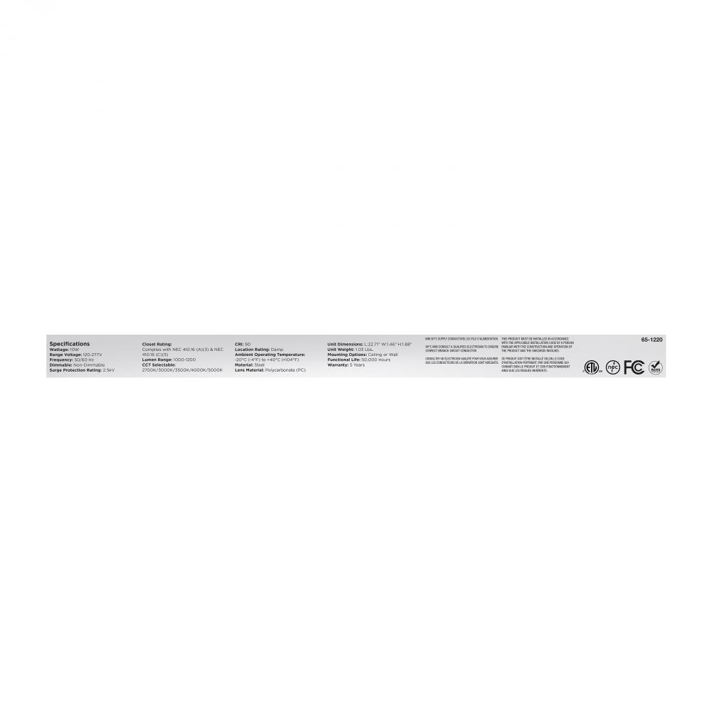 LED 2 Foot Strip Light; 10 Watts; 27K/30K/35K/40K/50K CCT Selectable; White Finish; 120-277 Volt