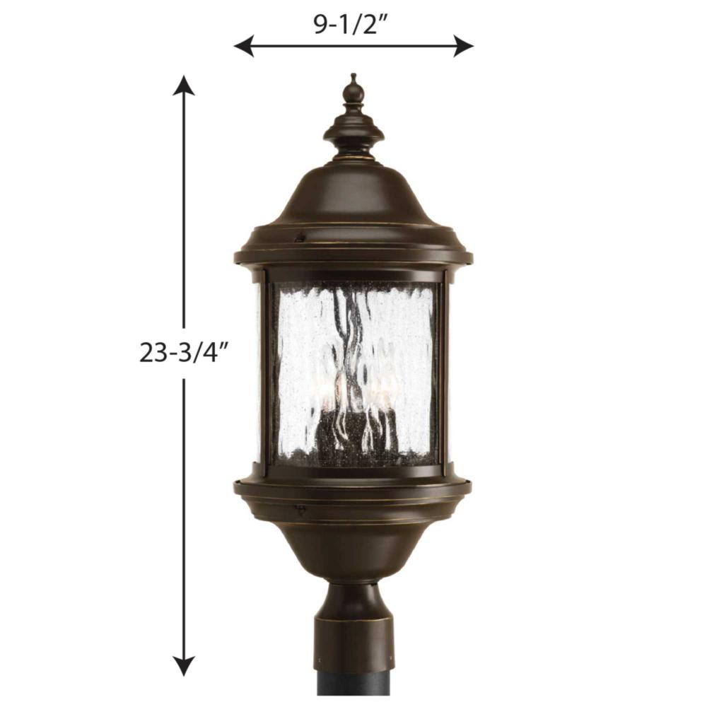 Inspired by lanterns from the Old World, the Ashmore collection incorporates handsome details, quill-scrolled arms and decorative finials. The water seeded glass is in a die-cast aluminum frame. The three-light post lantern. Antique Bronze finish.