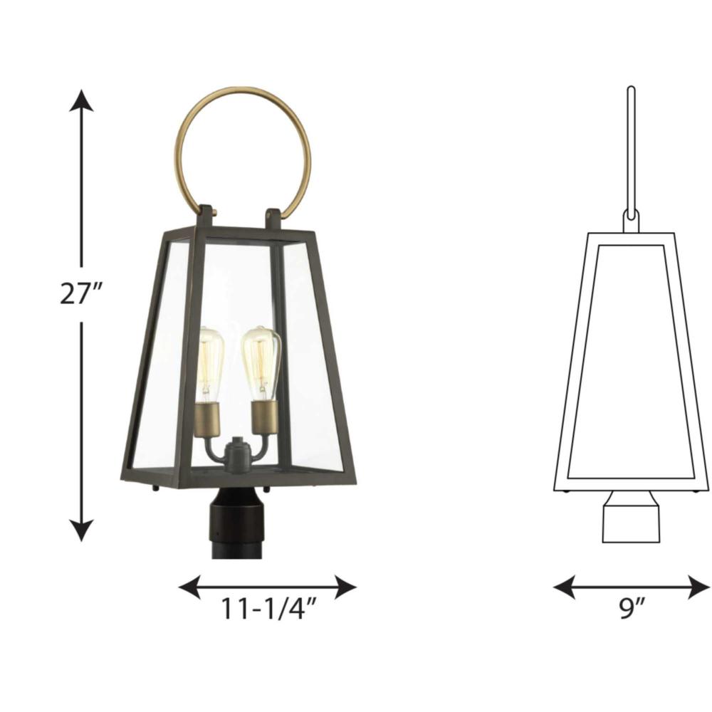 Barnett lanterns deliver timeless appeal with a decidedly modern flair. Large clear panes of glass frame your choice of traditional or vintage style bulbs. A graphic-inspired overscaled loop features a contrasting brass-tone finish. Two-Light Post Lantern.