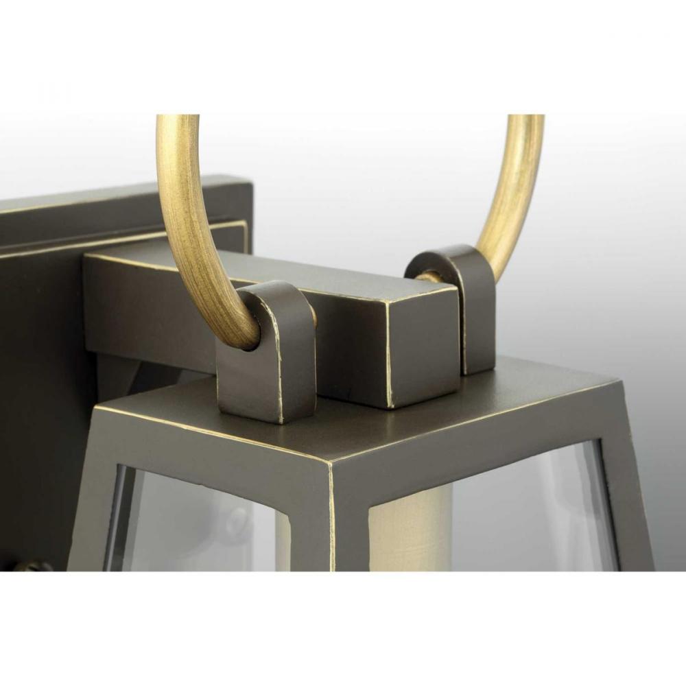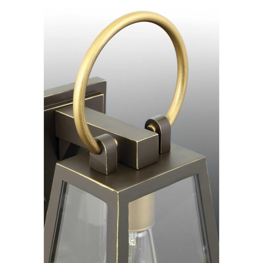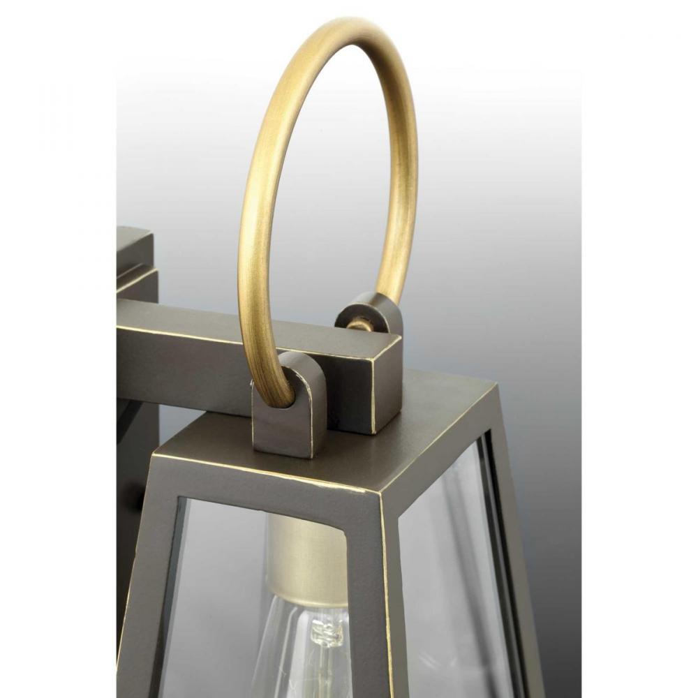 Barnett lanterns deliver timeless appeal with a decidedly modern flair;Features dramatic overscaled loop in a contrasting brass-tone finish;Antique Bronze finish;Large clear panes of glass frame your choice of traditional or vintage style bulbs;Uses two 60