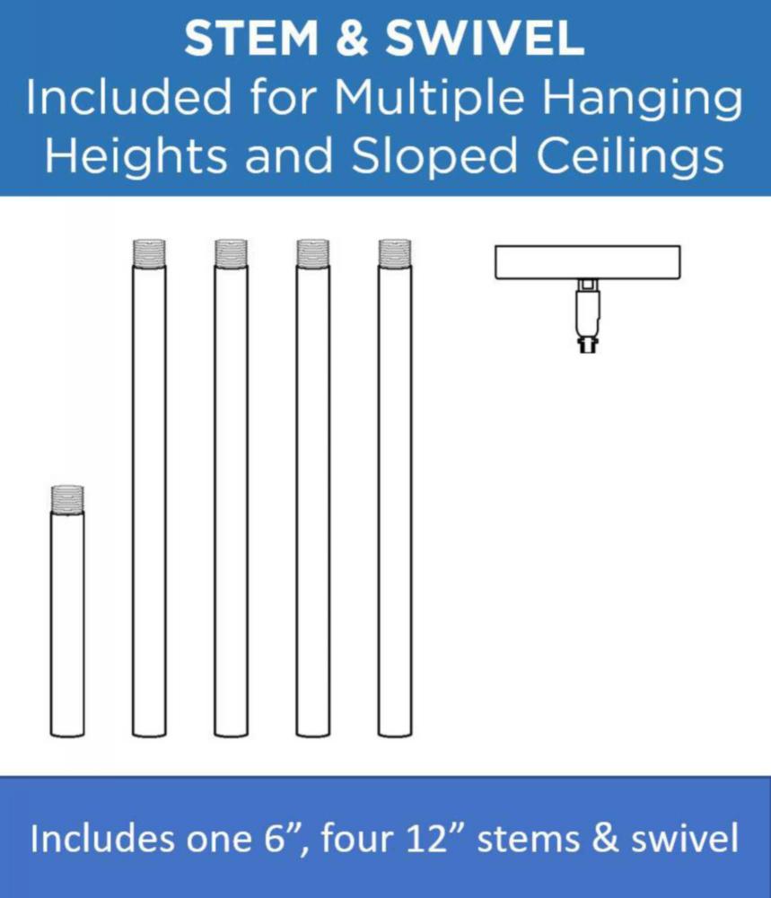 Includes one 6", four 12" stems and 6 links of chain for a variety of mounting types and sloped ceiling