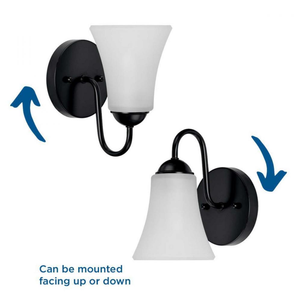 Ideal for a bathroom, hallway, or foyer;Perfect for traditional and transitional style settings;Classic matte black finish;Elegant etched glass shade;Mount the light fixture facing up or down;Use 1 medium base bulb that is sold separately (100 W max - LED/