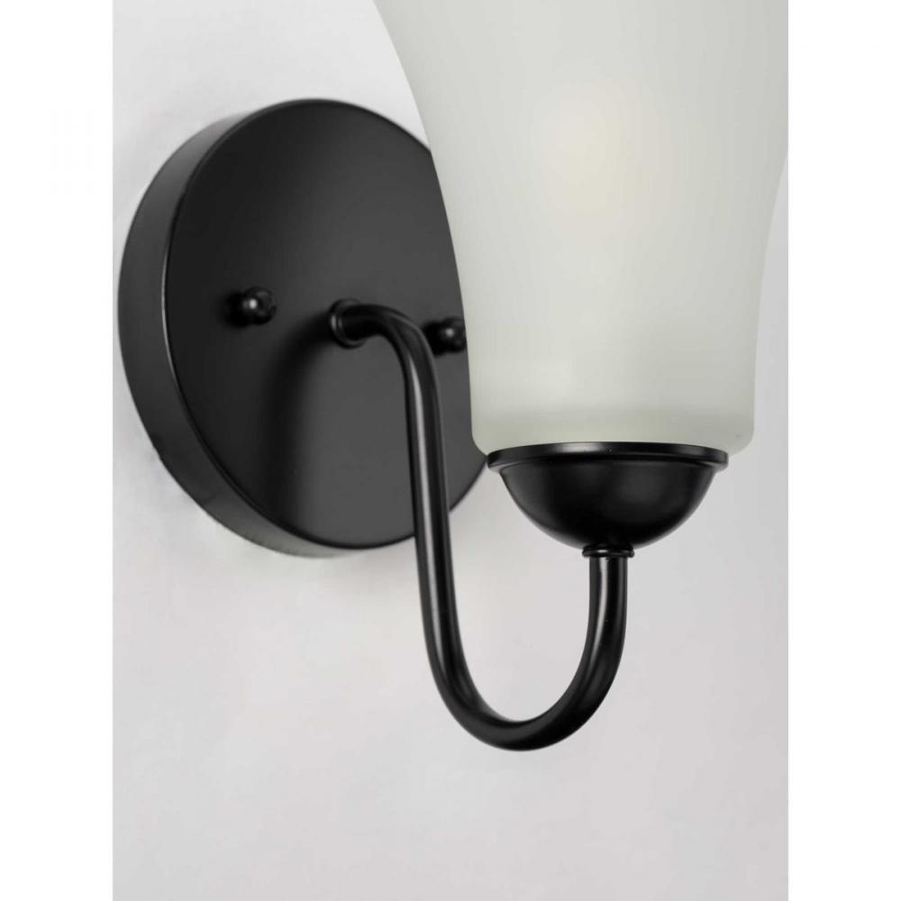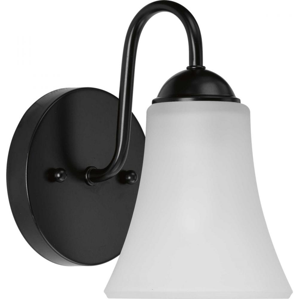 A distinguished, Black-finished circular backplate supports a graceful curved arm as it holds a bell-shaped, etched glass shade. This flawless fixture is perfect for chasing away the shadows around a bathroom mirror, in a dining room or in other living areas craving task light.