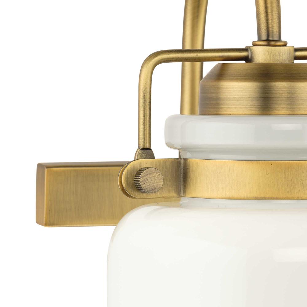 Distinctive mechanical details establish a nostalgic flair in the elegant Fessler collection. Opal glass shades deliver comfortable diffuse illumination to bathrooms and powder rooms in transitional and farmhouse settings. The decorative frame is coated in a stately vintage brass and features authentically crafted hardware elements that complements the curved opal shades. This versatile fixture can be mounted up or down, increasing its design flexibility. It is cULus damp location listed, with a one-year warranty to guarantee your complete satisfaction. Progress Lighting products are designed for exceptional quality, reliability, and functionality. .