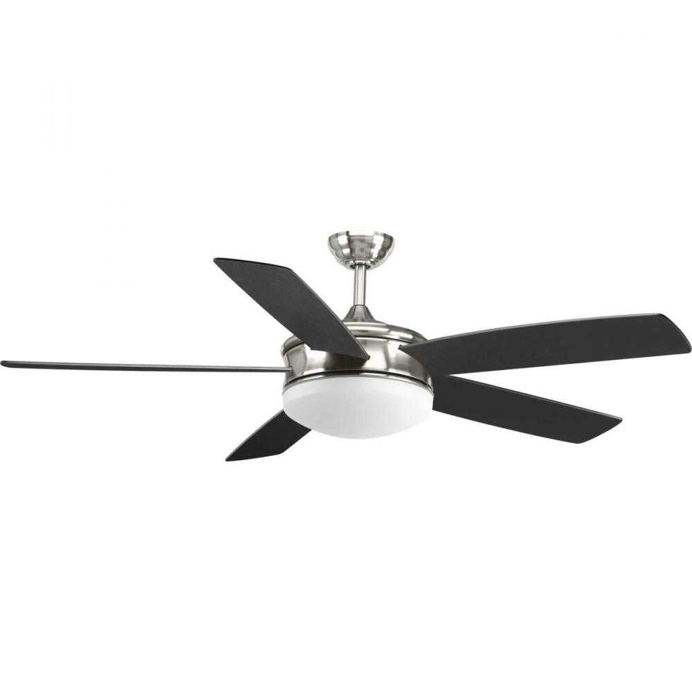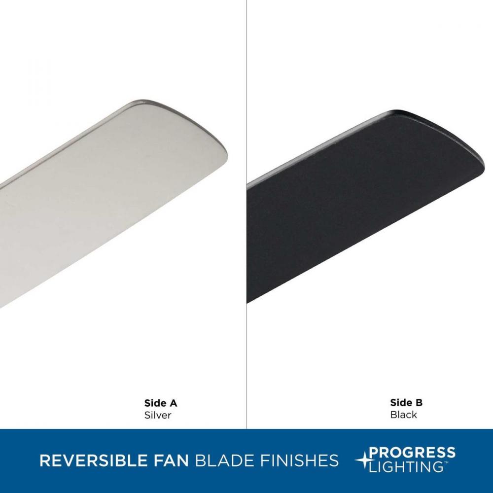 Five-blade 60" Fresno ceiling fan features an LED light source, offering both form and function with energy- and cost-savings benefits;Fresno ceiling fan features reversible Silver/Black blades with a Brushed Nickel finish;Indoor ceiling fan ideal for
