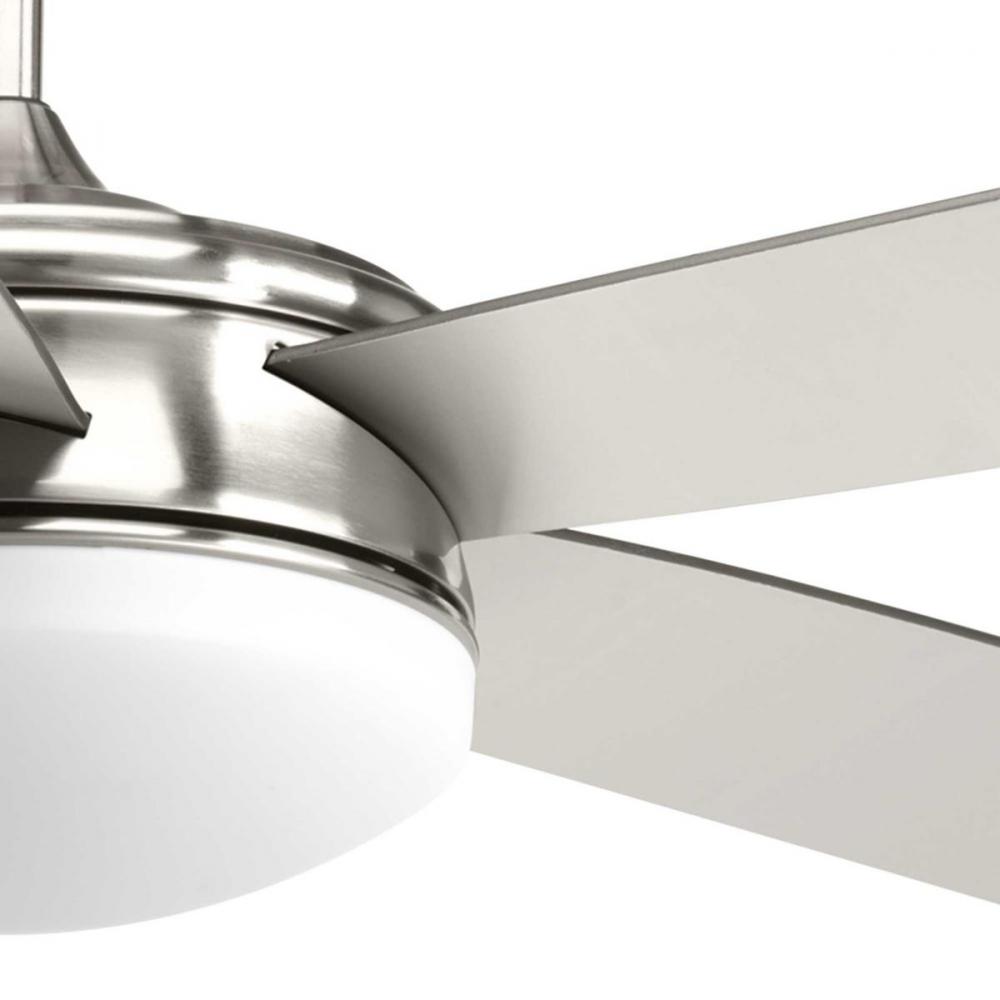 Five-blade 60 inch Fresno ceiling fan features with reversible blades in black and silver. The LED light source offers both form and function with energy- and cost-savings benefits. A white opal glass shade features an 18W dimmable, 3000K LED module. Full range dimming and remote control with batteries is included. Featuring reversible blades, the fan has a Brushed Nickel finish.