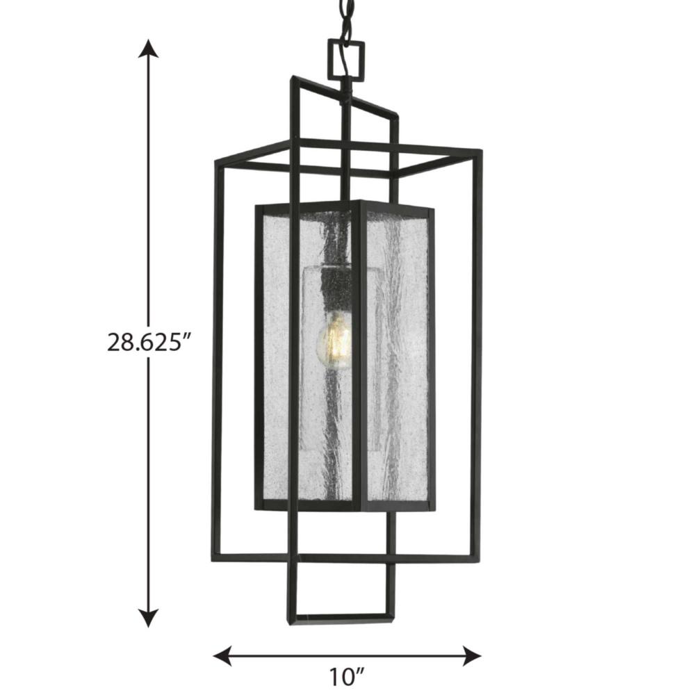 Define your favorite gathering spaces with the Navarre Collection 1-Light Matte Black Seeded Glass Transitional Outdoor Hanging Pendant Light. Several rectangular cubes nest within each other, forming a breezy angular silhouette coated in a classic matte black finish. Shimmering seeded glass panels cast a pleasing glow from the light source inside.